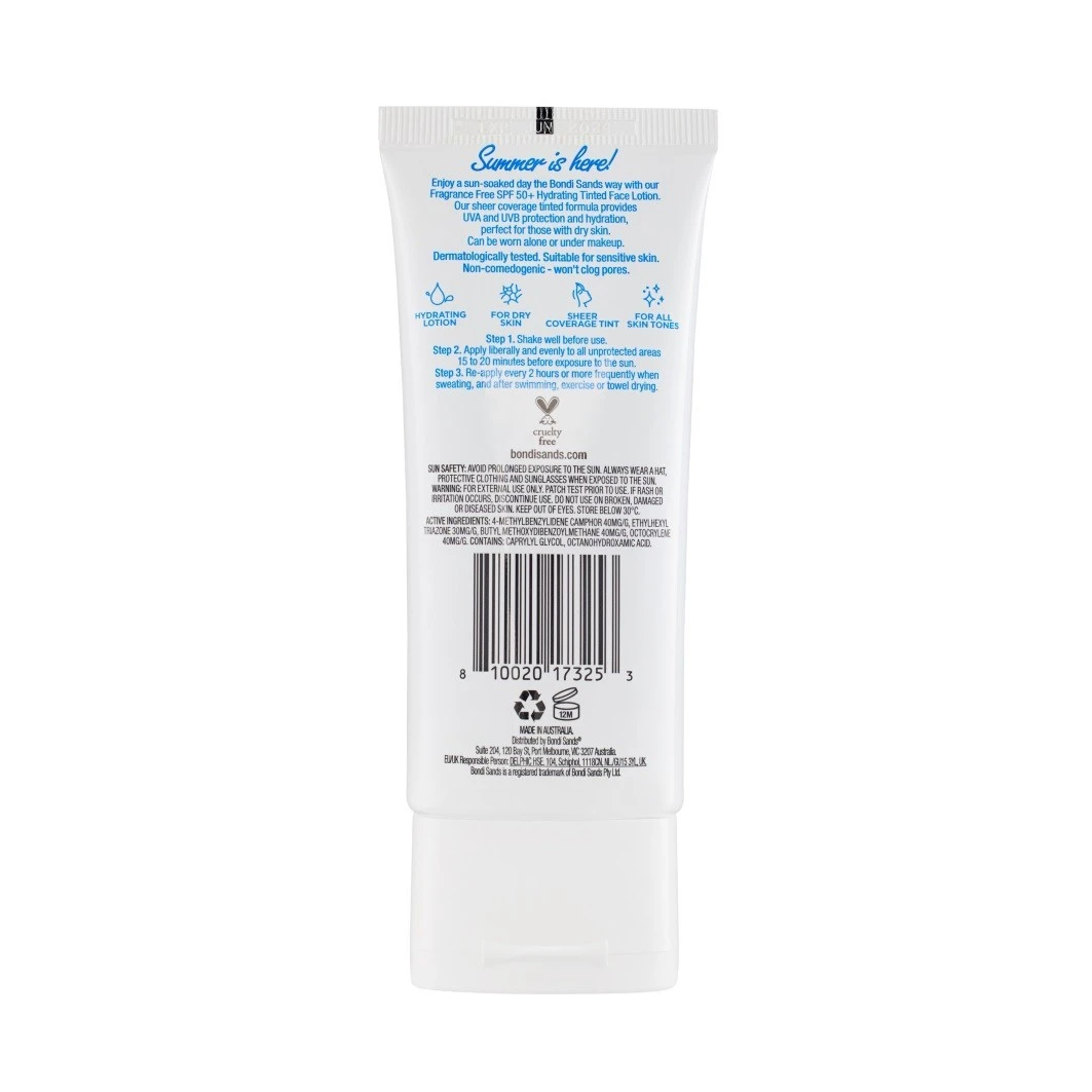 Bondi Sands Face Lotion SPF 50+ Tinted is een getinte, ongeparfumeerde lotion voor het gezicht met SPF 50+ UVA- en UVB-bescherming. De lotion heeft een universele tint om de huidskleur te egaliseren en laat geen witte waas achter. Perfect om onder make-up te worden aangebracht of als dagelijkse bescherming te gebruiken.
