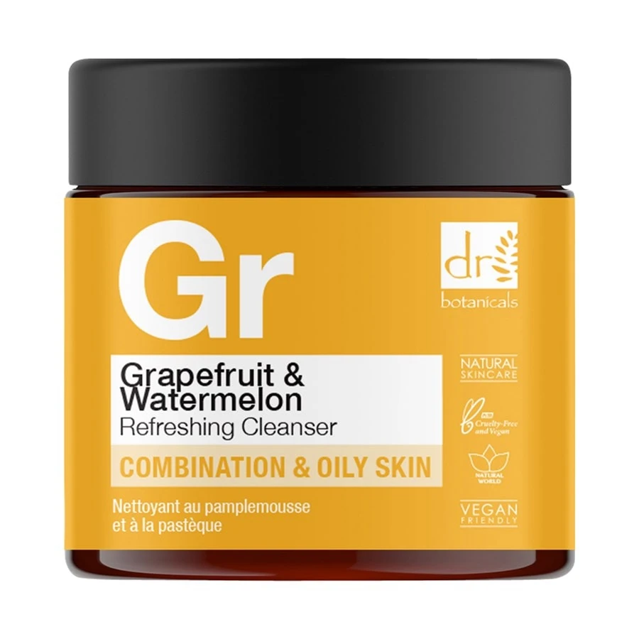 De Grapefruit & Watermelon Refreshing Cleanser van Dr Botanicals is een verfrissende huidverzorging die voor een evenwichtige teint zorgt. Het voorkomt onzuiverheden en reinigt de huid grondig zonder haar uit te drogen. De formule bestaat uit grapefruit, watermeloenpitolie en waardevolle planten-extracten. Grapefruit is rijk aan vitamine C, die de productie van collageen stimuleert.
