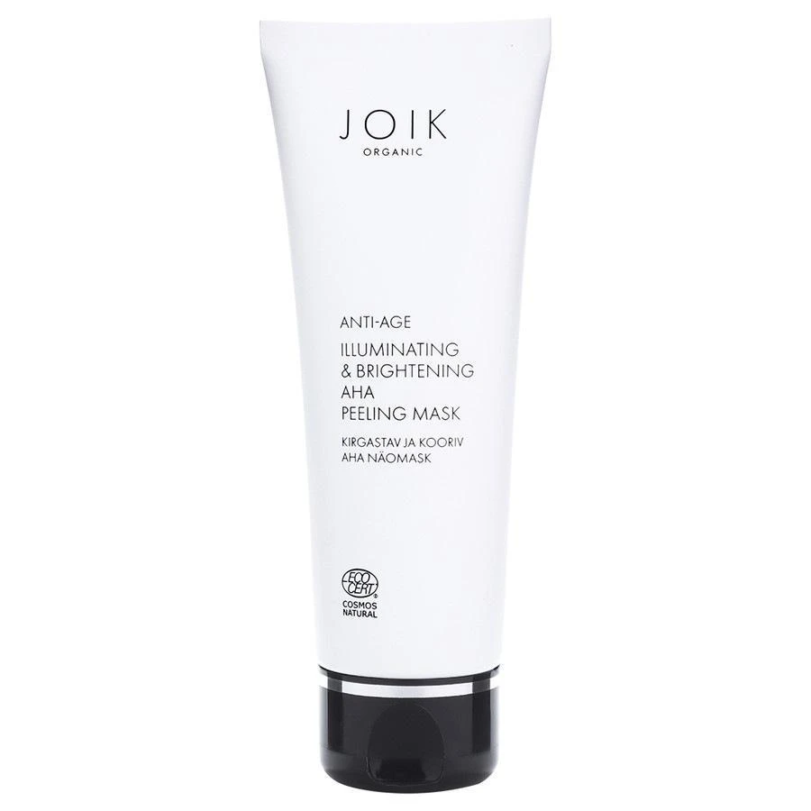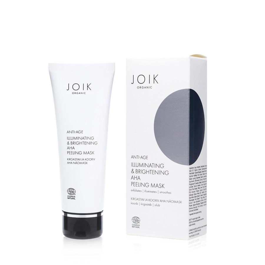 JOIK’s vegan Illuminating & Brightening AHA Peeling Mask exfolieert, maakt de huid glanzend en glad.