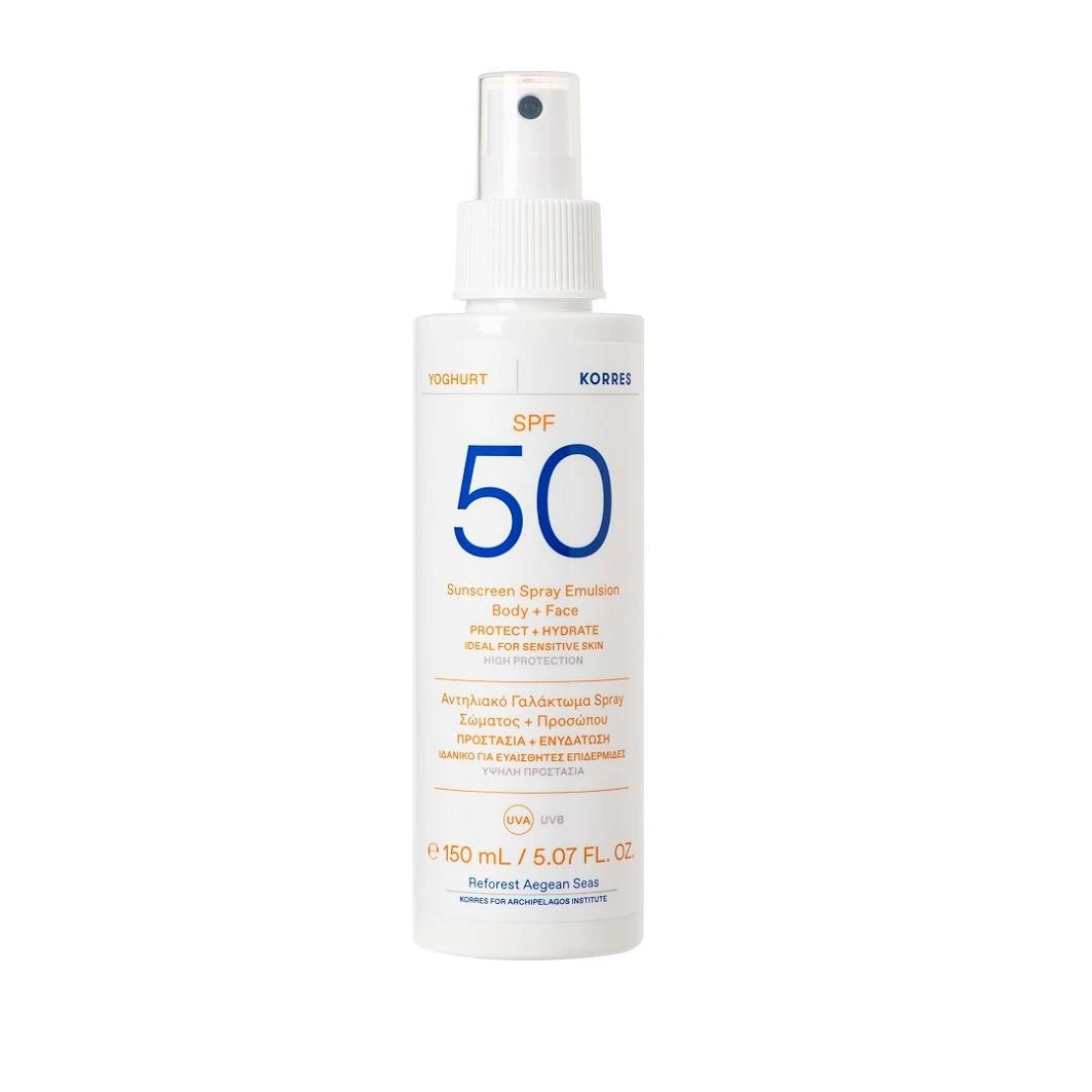 Yoghurt Sunscreen Spray Emulsion Face & Body SPF50 van KORRES is een snel absorberende zonnebrandspray-emulsie voor gezicht en lichaam die de huid langdurig hydrateert en haar aangenaam licht laat aanvoelen.