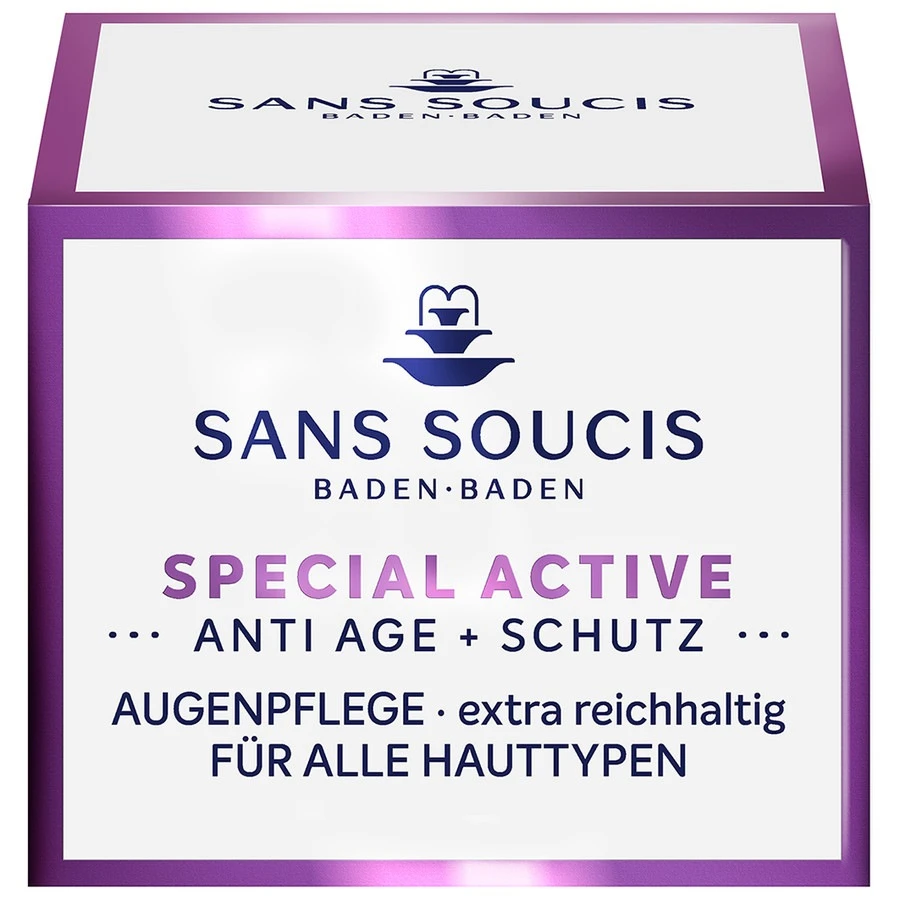 Sans Soucis Special Active Eye Care Extra Rich is een zeer rijke oogcrème met beauty vitamines A, E en H. W/O emulsie. Beschermt tegen ‘vrije radicalen’ en verhoogt het weerstandsvermogen. Mimische rimpels en tekenen van veroudering worden voorkomen en de reeds zichtbare lijntjes worden door hoogwaardige plantaardige oliën glad gestreken. Kraaienpootjes, wallen en donkere kringen onder de ogen worden effectief aangepakt. Anti Age 50+ oogverzorging, geschikt voor de rijpe extreem droge huid die extra comfort nodig heeft.